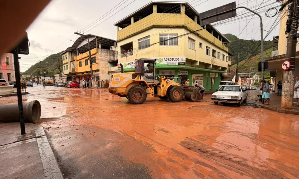 Equipes da Prefeitura de Muniz Freire trabalham na remoção de lama após o temporal de 107mm registrado nesta segunda-feira (9). (Crédito: Divulgação/Prefeitura de Muniz Freire)Um temporal avassalador atingiu as regiões do Caparaó e Serrana do Espírito Santo na tarde desta segunda-feira (9). O volume de chuva forte em Muniz Freire e Pedra Azul superou as previsões meteorológicas, registrando 107 milímetros em apenas uma hora. O fenômeno provocou o transbordamento de córregos, invasão de lama em comércios e deixou famílias desalojadas.