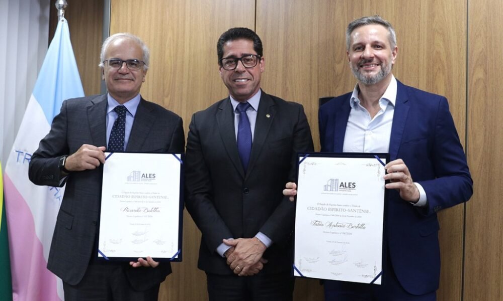 Ricardo Botelho (Energisa) e Fabio Bertollo (ES Gás) exibem a honraria ao lado de Marcelo Santos, presidente da Assembleia Legislativa.A Assembleia Legislativa do Espírito Santo concedeu, nesta terça-feira (10), o titulo cidadao espirito santense ALES a duas das principais lideranças do setor de energia do país. Ricardo Botelho, CEO do Grupo Energisa, e Fabio Bertollo, diretor-presidente da ES Gás, receberam a mais alta honraria da Casa. A cerimônia foi conduzida pelo presidente Marcelo Santos, em Vitória, e serviu para selar compromissos econômicos que impactarão a Grande Vitória e todo o Estado.